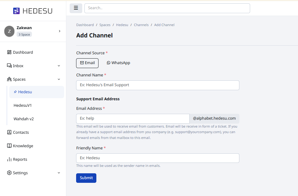 For WhatsApp insert your channel name and company hotline, then click the Submit button.