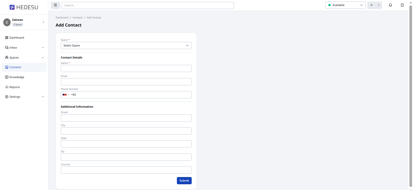 Note: System will automatically creates contact when a users reaches out via WhatsApp or Email.