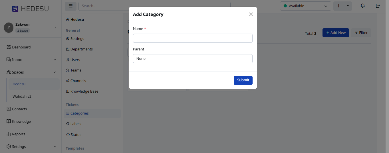 Enter the category name and set the parent to None or choose an existing category to make it as a subcategory. Then, click Submit button.