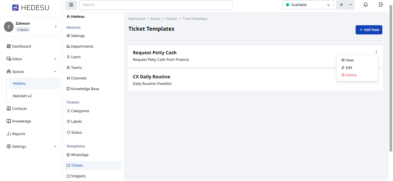 For managing the existing template ticket simply click on the ellipse icon on right of the box and click View to view the details.